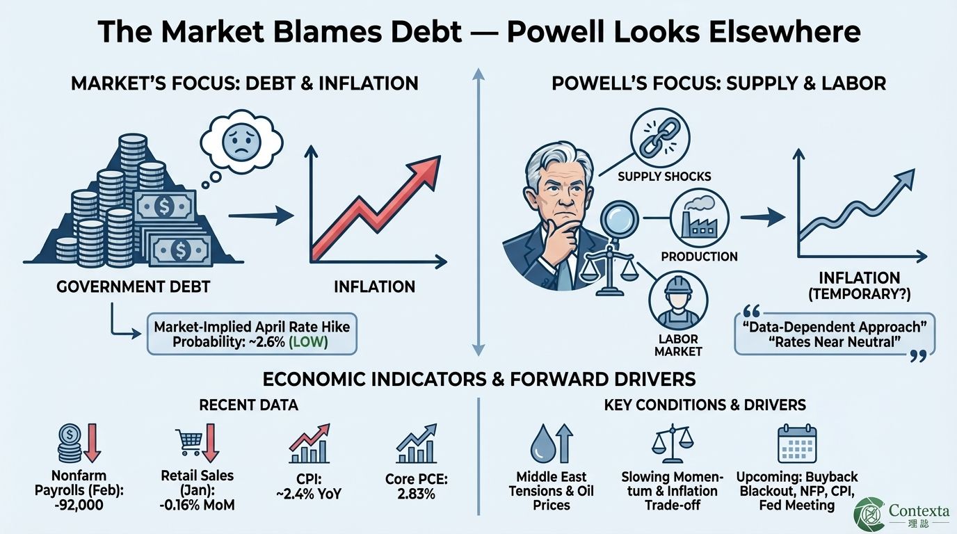 From a market perspective, this distinction reframes what investors should monitor. If inflation is not primarily debt-driven, then focus shifts toward whether supply shocks persist, whether demand weakens, and whether the labor market deteriorates further. Recent economic data already point in that direction, with softer employment and consumption trends suggesting a slowdown in growth momentum. This increases the likelihood of a deeper market correction, and raises the probability of at least one rate cut within the year, as the Fed responds to growth risks rather than inflation alone.