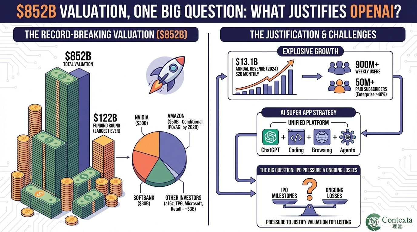 OpenAI completed a record-breaking $122B funding round, bringing its valuation to $852B, the largest capital raise exceeding any historical IPO scale.
